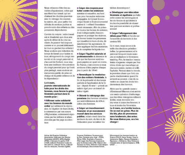« Le 8 mars, on s’arrête tout·e·s. On se met en grève. Plus de bla bla, plus de promesses sans lendemain, des #actes. Ne nous libérez pas, on s’en charge ! »