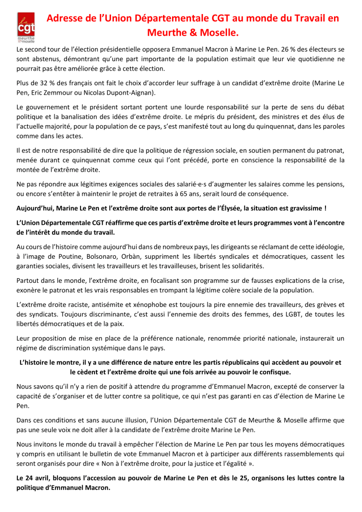 Nous invitons le monde du travail à empêcher l’élection de Marine Le Pen par tous les moyens démocratiques y compris en utilisant le bulletin de vote Emmanuel Macron et à participer aux différents #rassemblements qui seront organisés pour dire « Non à l’extrême droite, pour la justice et l’égalité ».