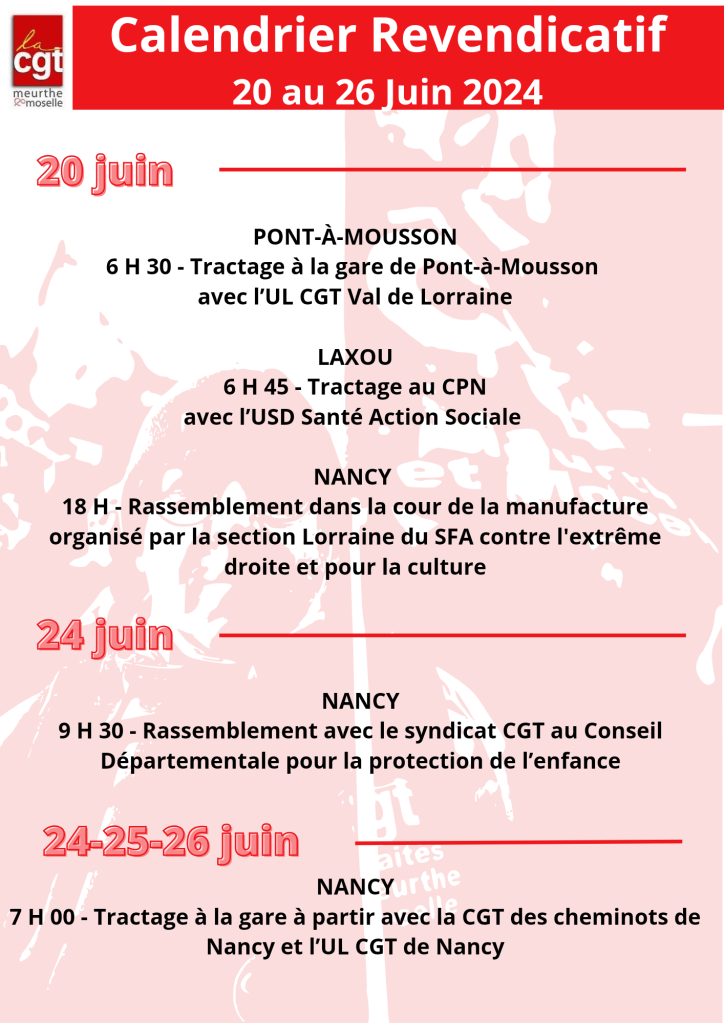 [24-06-19] MEURTHE-ET-MOSELLE – Calendrier Revendicatif Publié parudcgt5419 juin 202411 juillet 2024Publié dans2024, CALENDRIER REVENDICATIFÉtiquettes :CALENDRIER REVENDICATIF, CGT, meurthe-et-moselle, Mobilisation, syndicat Calendrier revendicatif En savoir plus sur Union Départementale CGT de Meurthe-et-Moselle Abonnez-vous pour recevoir les derniers articles par e-mail. Saisissez votre adresse e-mail… Abonnez-vous Partager : Cliquer pour partager sur X(ouvre dans une nouvelle fenêtre) X Cliquez pour partager sur Facebook(ouvre dans une nouvelle fenêtre) Facebook J’aime chargement… Similaire