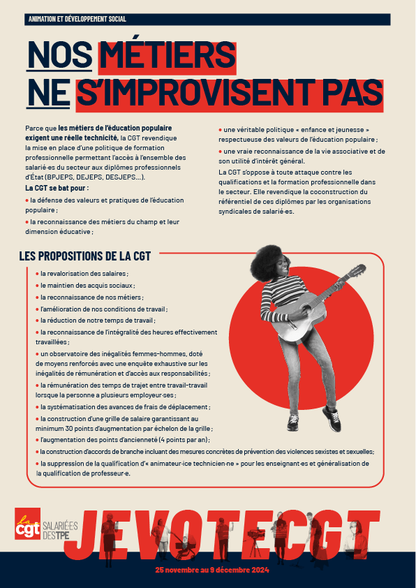 Parce que les métiers de l’éducation populaire exigent une réelle technicité, la CGT revendique la mise en place d’une politique de formation professionnelle permettant l’accès à l’ensemble des salarié·es du secteur aux diplômes professionnels d’État (BPJEPS, DEJEPS, DESJEPS…).