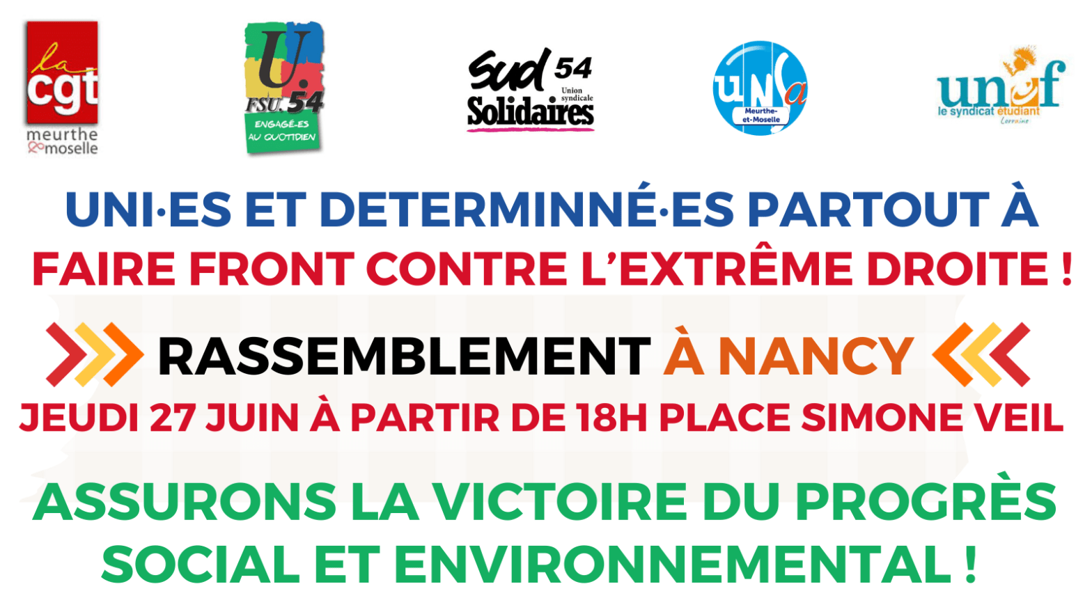 Après le soulèvement populaire du samedi 15 juin à Nancy : RASSEMBLEMENT INTERSYNDICALE Dimanche 23 juin à 11 h 00 – Place Charles III à Nancy Sonnons les alertes féministes, soyons encore plus uni-e-s contre l’extrême droite !